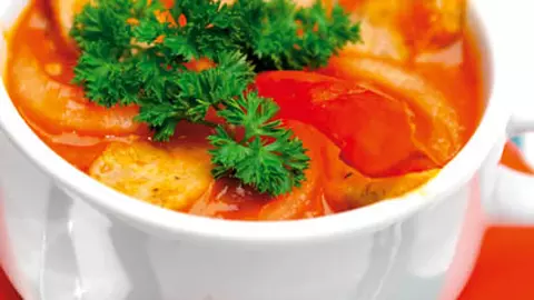 Supă de roşii cu fidea şi spirale crocante de aluat franţuzesc