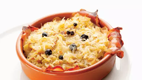 Budincă de cartofi cu cârnaţi şi sos de caşcaval