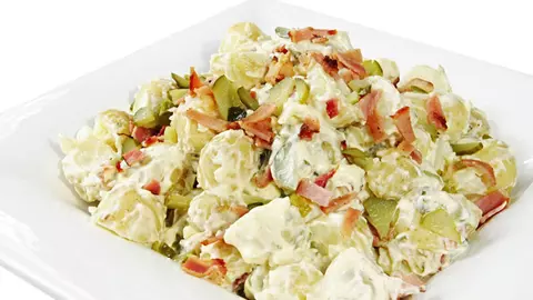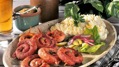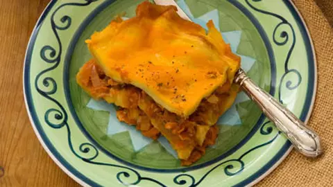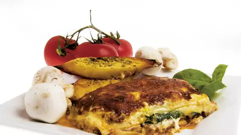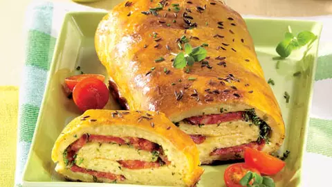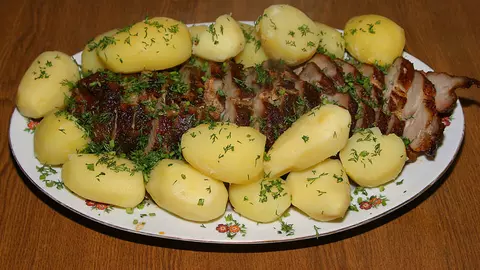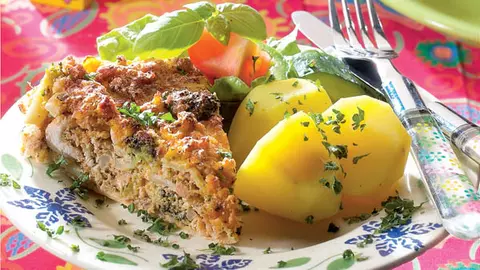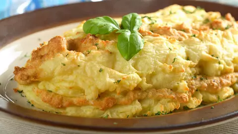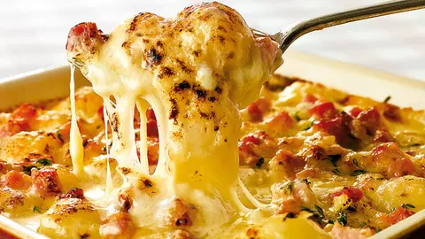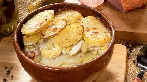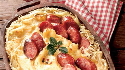 Budincă de cartofi cu cârnaţi şi sos de caşcaval