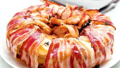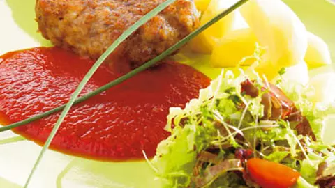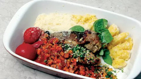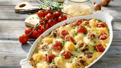 Roşii gratinate cu perişoare de carne şi cartofi cu brânză