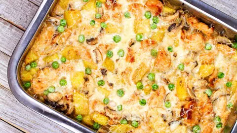 Caserolă de pui, ciuperci și cartofi în sos cremos