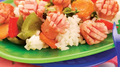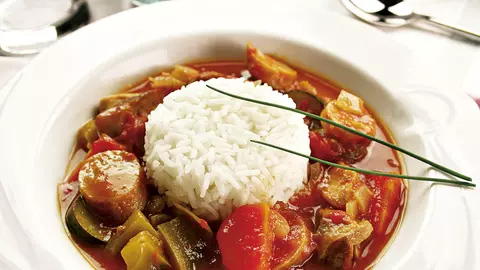 Orez cu sos şi cârnaţi picanţi