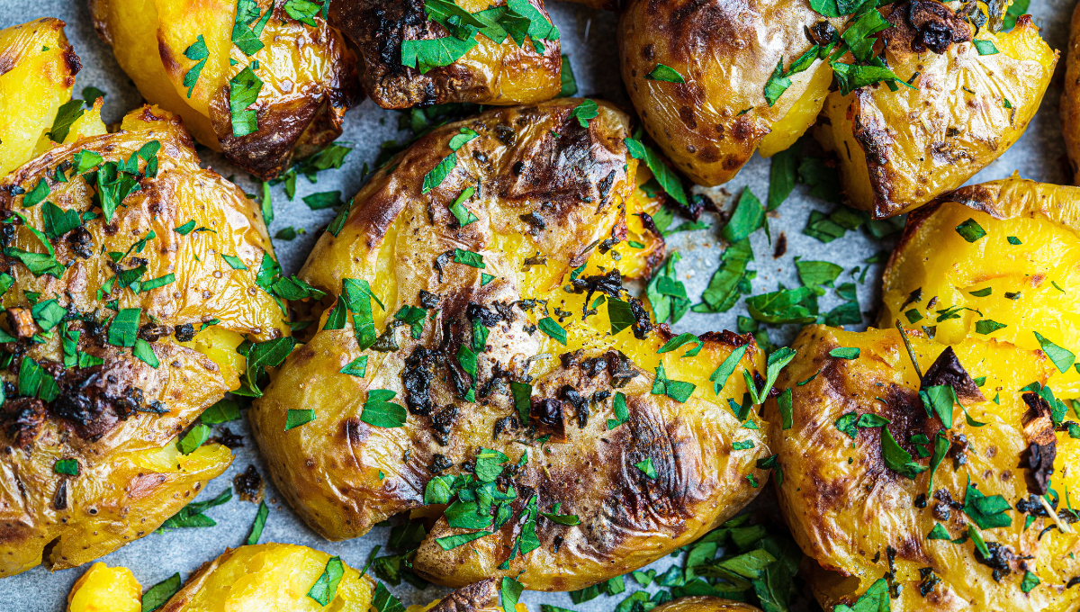 Simpli, aromați și irezistibili – cartofi „zdrobiți la cuptor cu usturoi și pătrunjel