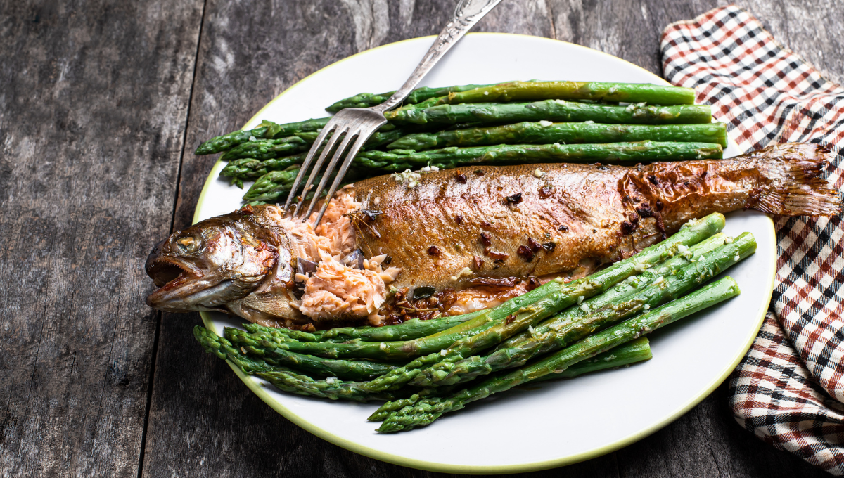 Păstrăvul trebuie să fie proaspăt – carne fermă, miros neutru, piele lucioasă. Orice compromis aici se va amplifica în farfurie. Sparanghelul trebuie să fie crocant, cu tulpini ferme și vârfuri închise, semn că este în punct optim de consum.