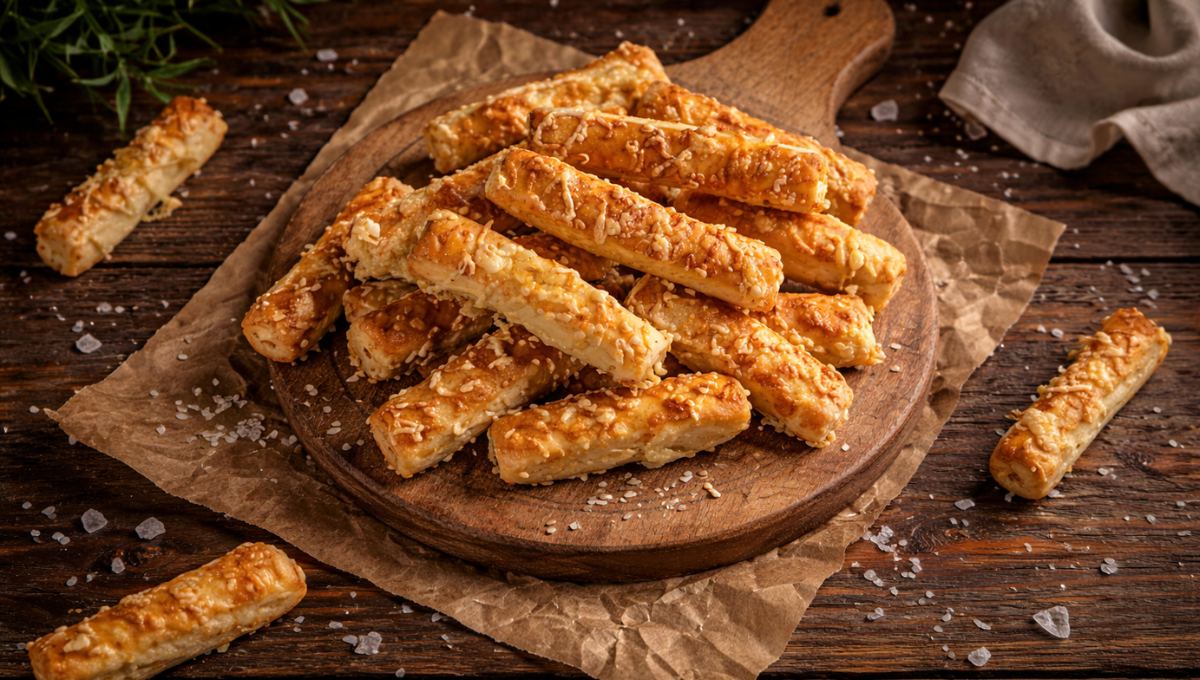 - Întinde aluatul la o grosime de 0,5 cm, unge cu ou bătut și presară cele 3 linguri de parmezan rase. Taie aluatul în fâșii dreptunghiulare de 1 cm lățime și așază-le pe o tavă unsă ușor, păstrând spațiu între ele. Poți răsuci fâșiile pentru a crea batoane spiralate sau le poți lăsa drepte.