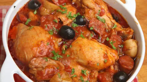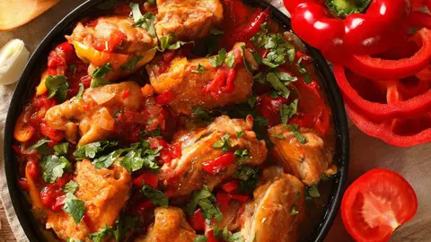 Pui cu usturoi şi busuioc în sos de unt și roşii